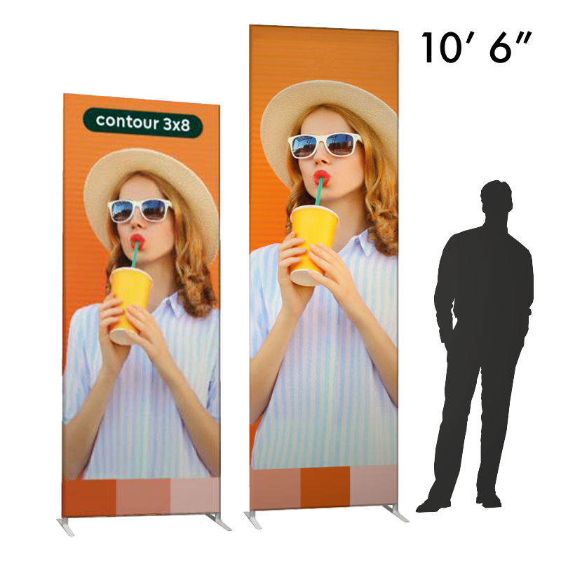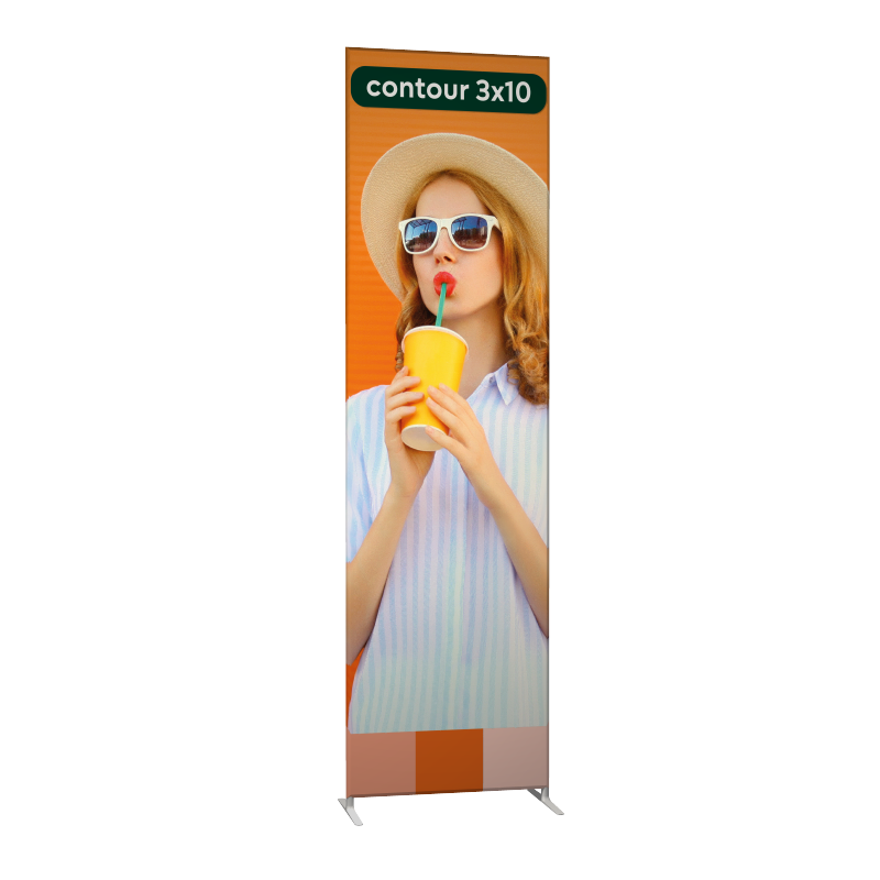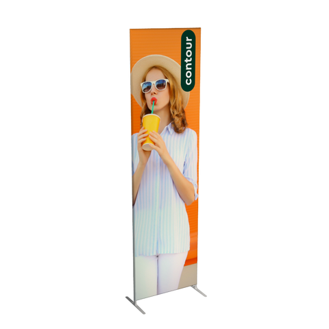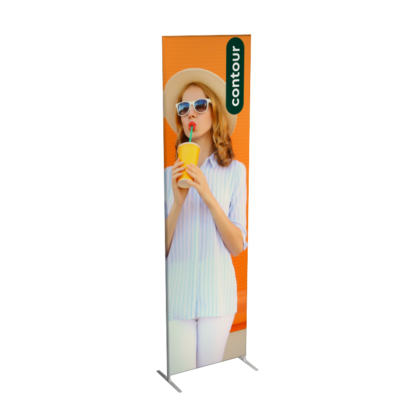 contour is a portable stand solution featuring a tubular aluminum structure covered in stretch fabric. The frame is quickly assembled without requiring any tools or extra parts. The graphic slips over the frame like a sock and covers the frame completely for exceptional color execution.