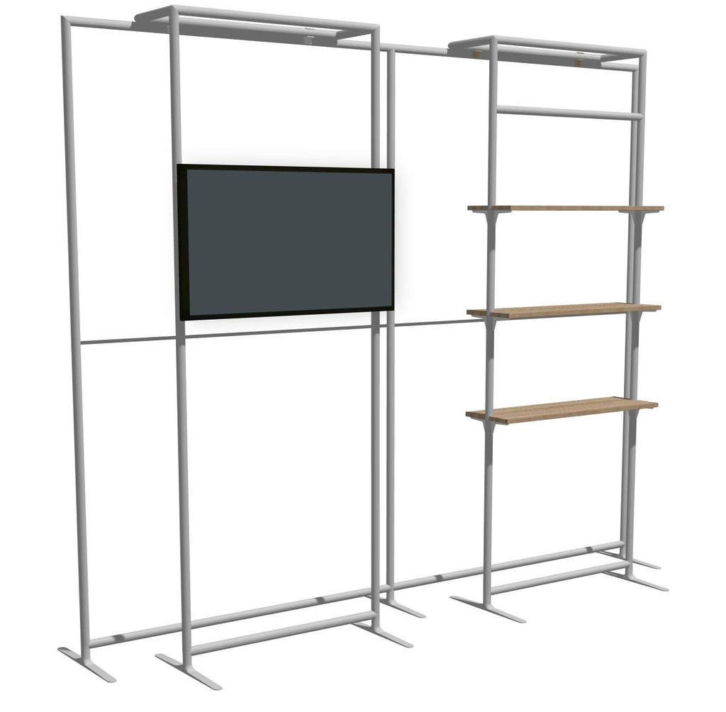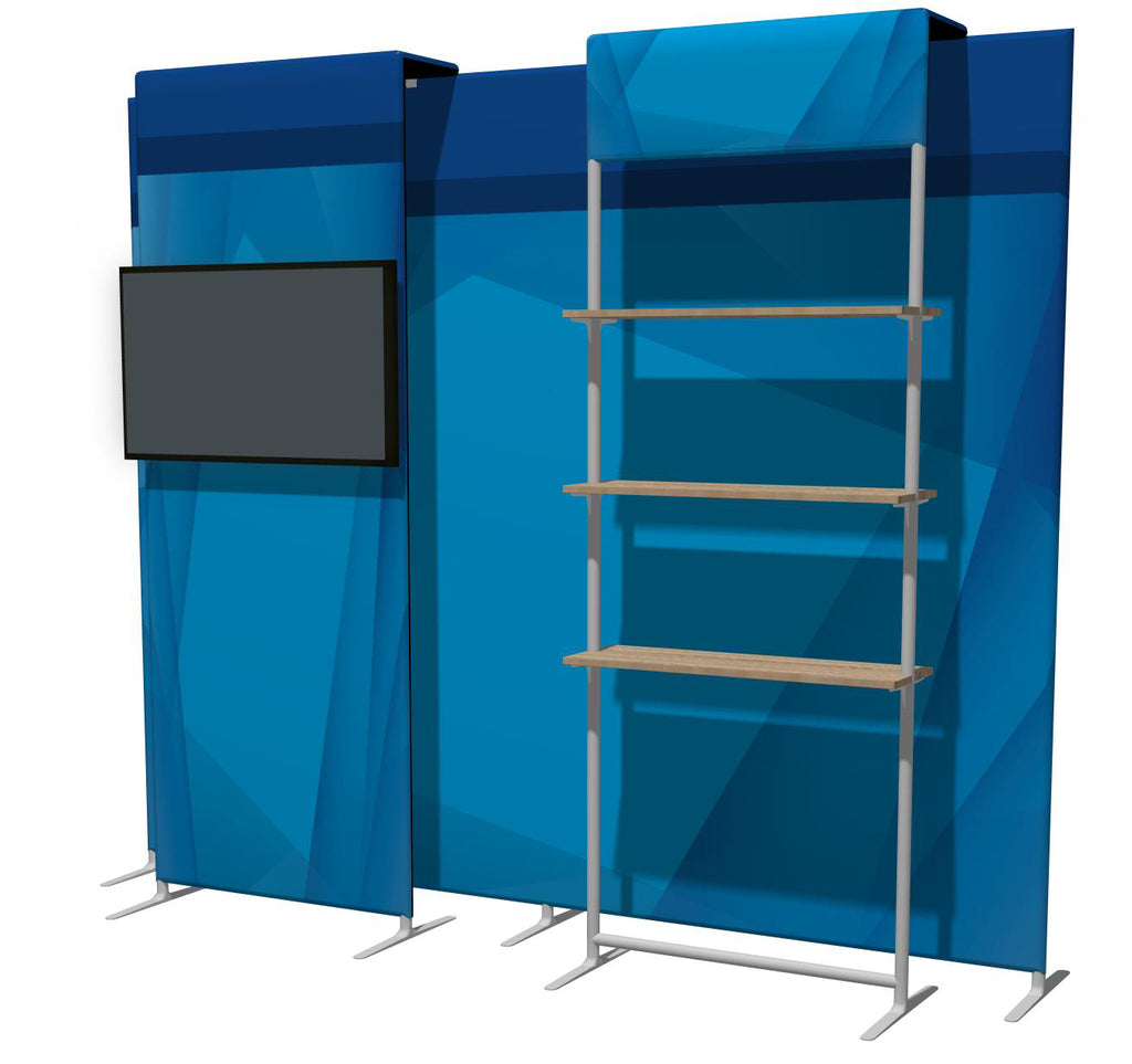 A portable stand solution featuring a tubular aluminum structure covered in stretch fabric. The 10 foot back frame connect to the 3 foot wide TV frame and a 3 foot shelving unit.