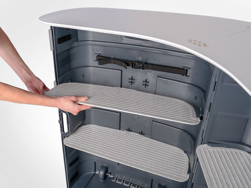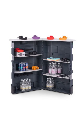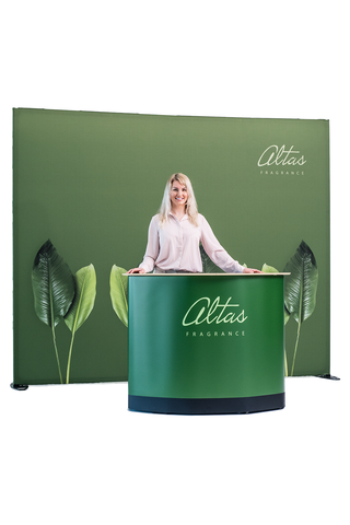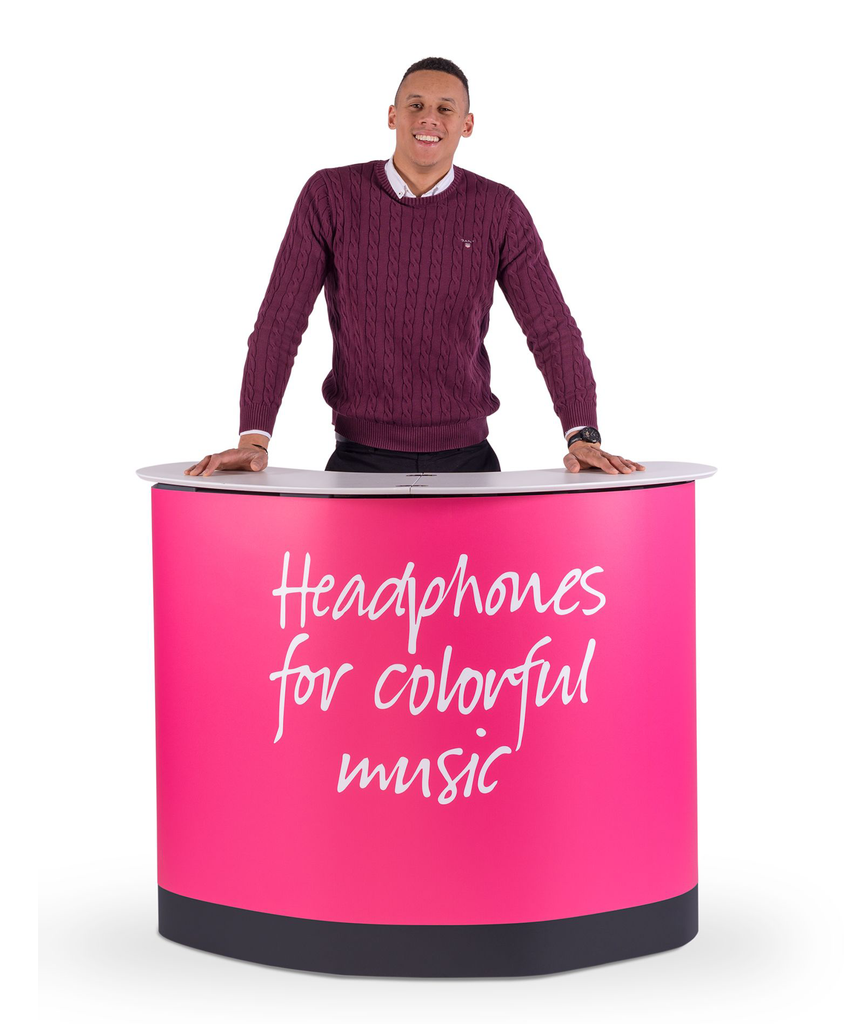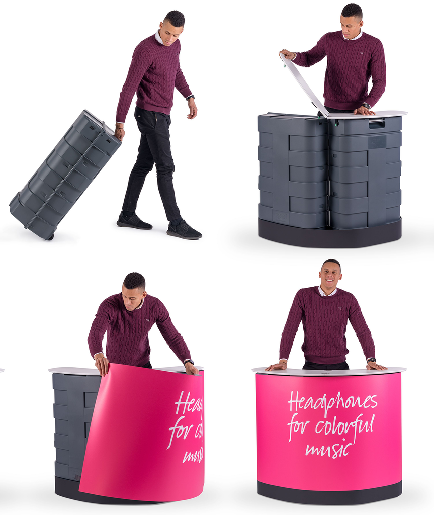 With its multi-functionality - both a counter and a shipping case - this is one of our most popular products. Pack, carry and store your backwall or entire booth in the case. As a counter, it is sturdy and has a lot of space to welcome your customers or demonstrate your products. Shelves on the inside and other add-ons such as brochure pocket and monitor holder are available. The graphic wrap for your logo or brand is easy to exchange - use this highly durable counter year after year and just update your graphic.